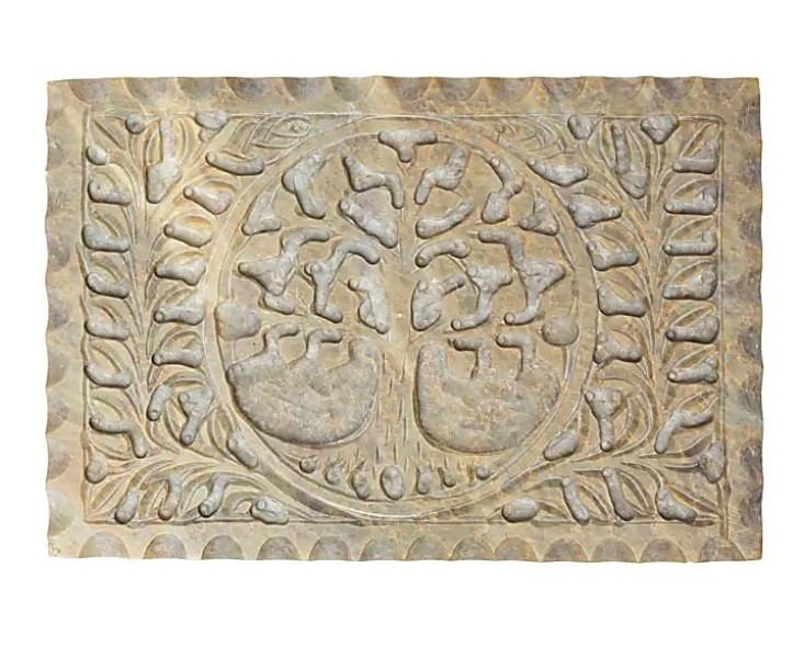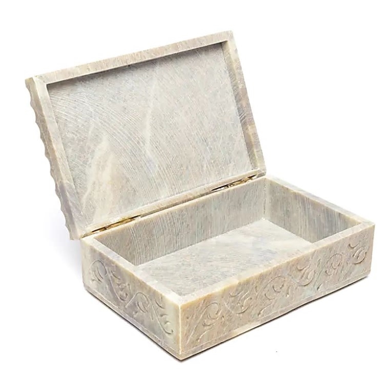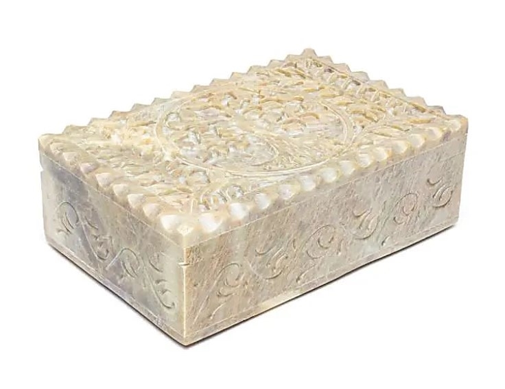 Tarot- eller smykkeskrin lavet af naturlig fedtsten med et fint udskåret motiv af livets træ i låget.