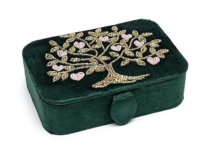 Disse æsker har et blødt fløjlsyderlag med indviklet broderi, hvilket gør dem til et smukt og funktionelt stykke opbevaring af små skatte. De rige farver og raffinerede detaljer giver dem en unik tilstedeværelse i enhver samling.