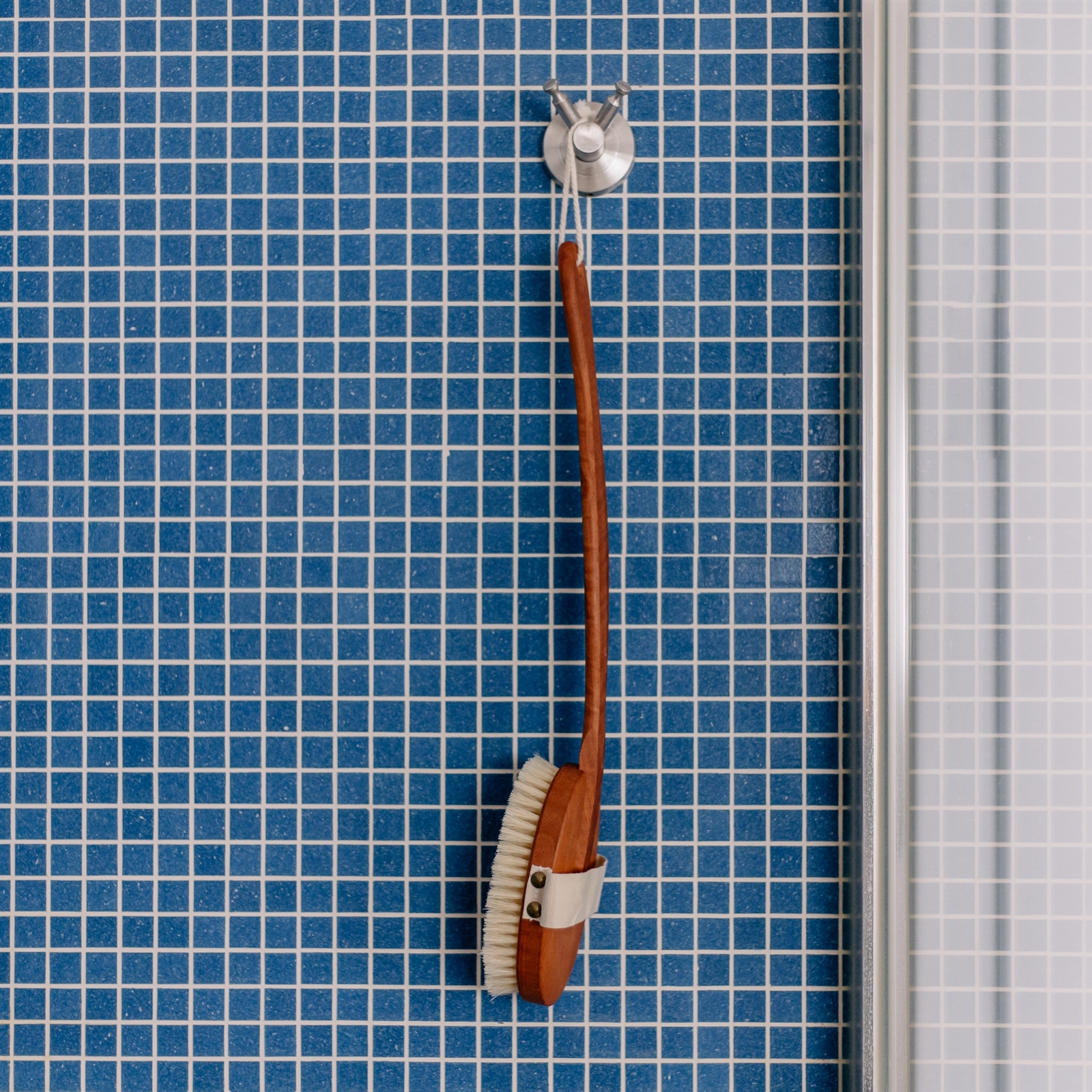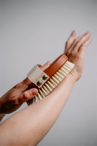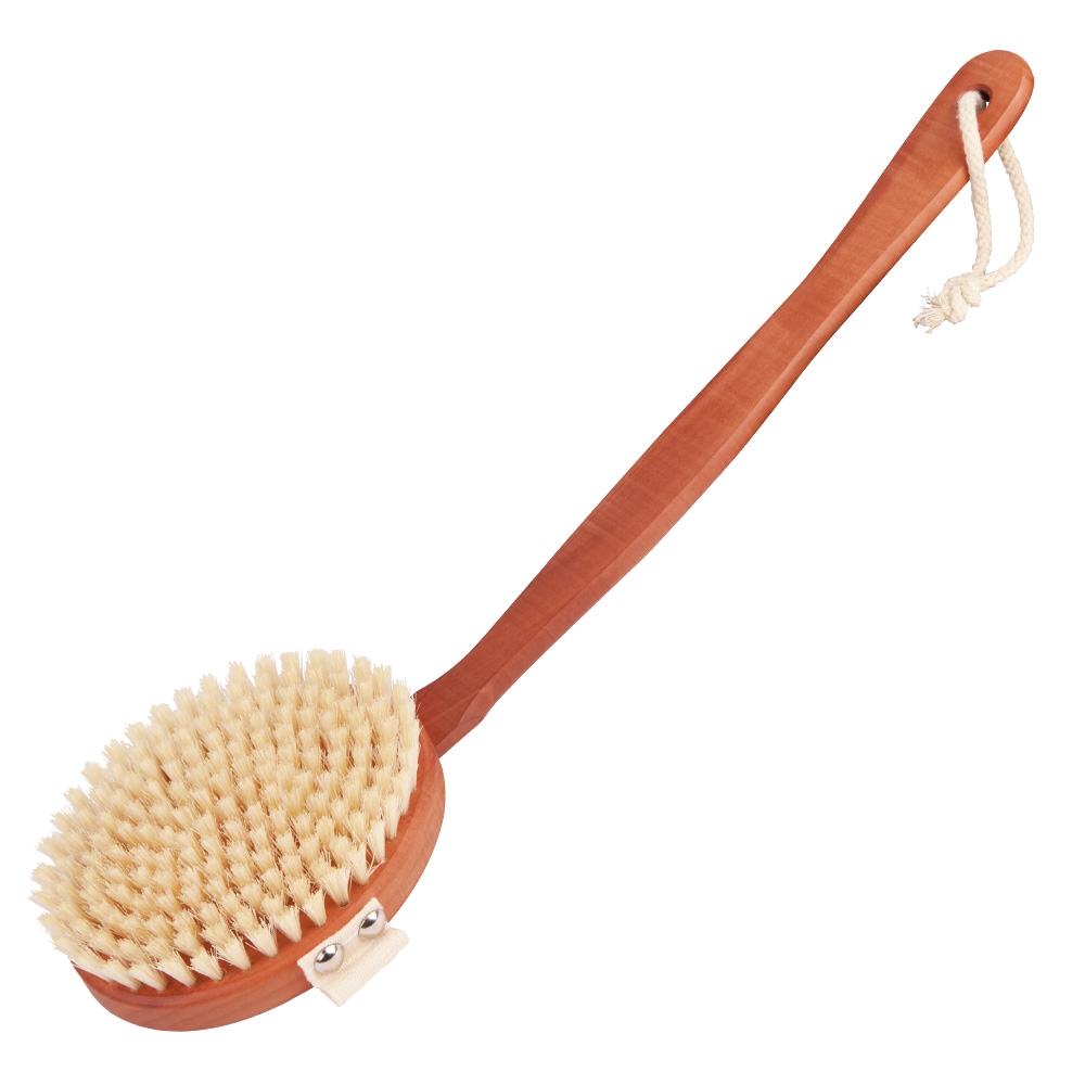 Lækker badebørste til badet i flot mørkebrunt træ. Badebørsten er med skaft. Fremstillet i varmebehandlet træ.