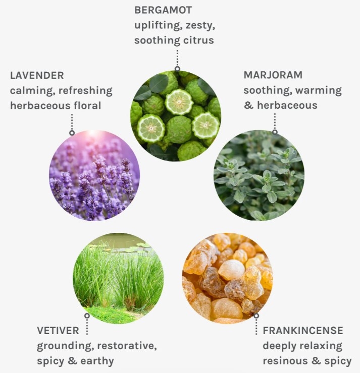- Balanceret ro: Fremmer afslapning, mental klarhed og skaber en beroligende atmosfære med en blanding af bergamot, lavendel, merian, røgelse og vetiver.