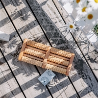 Massagerulle til fødder i træ. Fodrullen er dobbelt og med 3 ruller på hver side, så du kan massere begge fødder på en gang.
