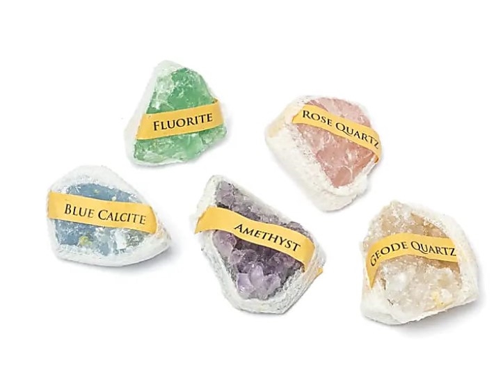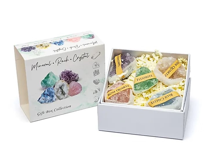 Oplev den naturlige skønhed i jordens skatte med vores mineralgaveæske. Denne kollektion indeholder et kurateret udvalg af rosenkvarts, blå calcit, ametyst, krystalgeode og fluorit. Ideel til at give fredelige gaver eller til personlig samling.