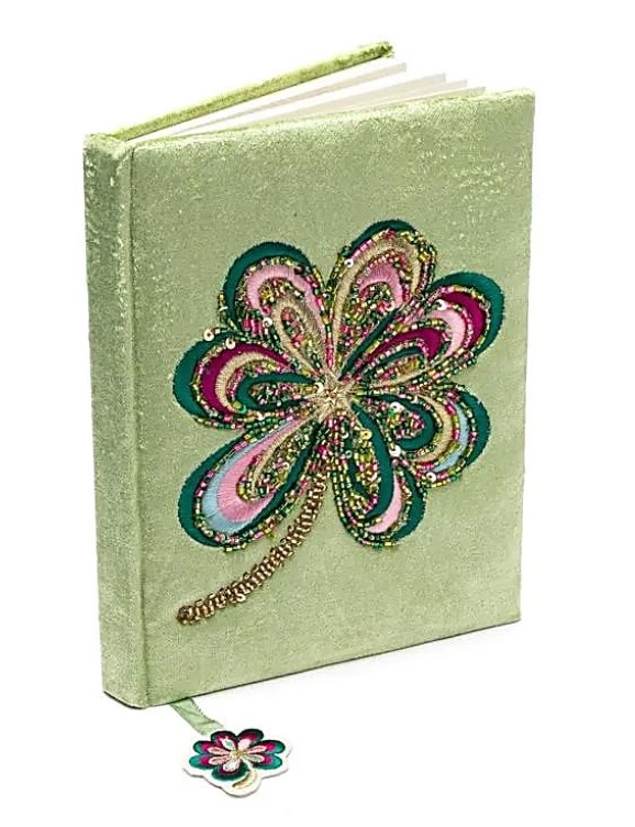 Blød fløjlsnotesbog med fint broderi og dekorative perler.