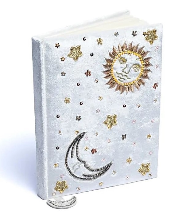 Blød fløjlsnotesbog med fint broderi og dekorative perler.