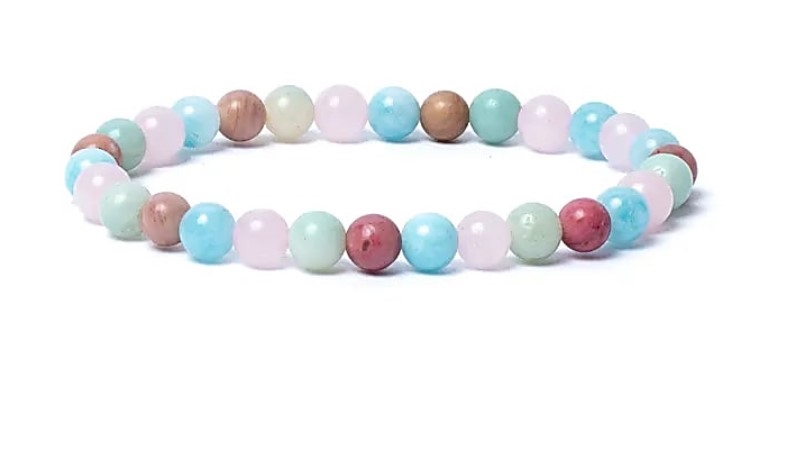 Elastisk armbånd lavet med 6 mm perler af AA-kvalitets akvamarin, rosakvarts, amazonit og thulit.