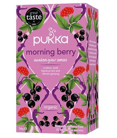 Pukkas økologiske Morning Berry te, er skøn at nyde om morgenen. Sprængfyldt med søde solbær, saftige brombær og forfriskende hibiscus, komplimenteres de frugtagtige smage af rooibos, rosmarin og ginseng.