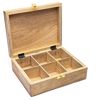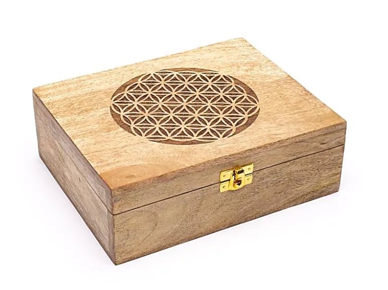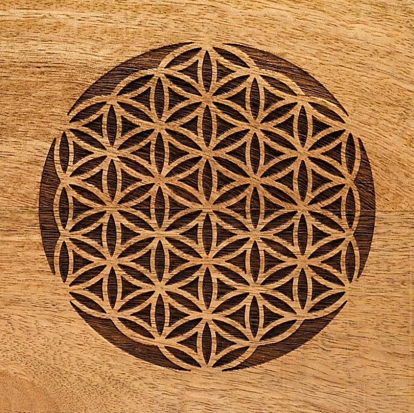 Træteæske lavet af mangotræ med en detaljeret gravering af Livets Blomst-symbolet på låget.